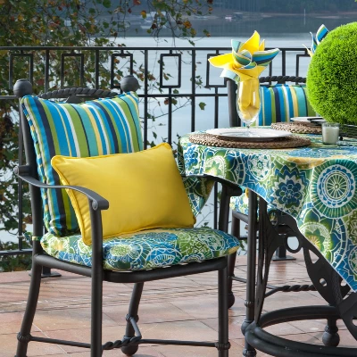 Magnificent stripes create the look of a charming summer escape with this set of two outdoor decorative pillows. Their pattern has fun stripes with varying widths in refreshing shades of blue, green, yellow and white. Made of fade-resistant polyester fabric, they’re perfect for a patio or sunroom. Additional features of these outdoor decorative pillows include self welt cords for a clean finish and recycled polyester fiber fill with sewn seam closures. Also suitable for indoor use.