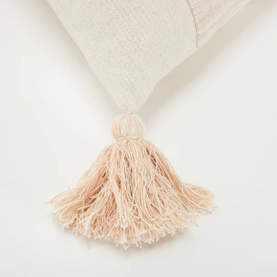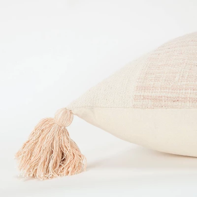 This pillow is part of the Donny Osmond Home Collection. This pillow features a color blocked construction and BOTH weaves featured take center stage. The central block is tonal in blush and ivory and uses different yarn thicknesses to create slubs that are so beautifully random and organically placed. The other block is a flatter woven cotton whose weave also yields subtle dimension and soft stripe patterning. An ever so light brushing brings all the softness of BOTH cotton applications to center stage. Four chunky two-color blended tassels accent the corners of this knife edged wonder. A solid natural coordinating back features a hidden zipper closure for ease of fill.