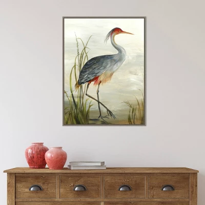 heron standing in profile on the banks of a body of water. Is he looking at his next meal or his true love? We do not know, but the plants have parted, making a space for him as he decides what to do next. This Amanti Art canvas art print was created by Aimee Wilson and printed by Amanti Art in Madison WI. The canvas is stretched by hand and finished with a float frame. Individually made using traditional custom framing techniques, it has the quality you would expect from your local frame shop. Because of our attention to detail and focus on artistry, architects, interior designers, and homeowners alike choose this framed canvas artwork to create beautiful living spaces.