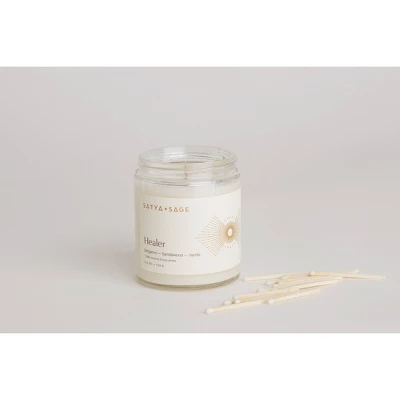 Create a soothing, grounding atmosphere for self-care and relaxation in your home with the earthy and relaxing scent of the Healer Candle from Satya + Sage. This eco-friendly vegan candle is made with coconut and soy wax, and is infused with phthalate-free fragrance oils for a warm, woody scent with bergamot, sandalwood and vanilla notes. The nature-inspired aromas help create a calming and grounding effect while you enjoy some downtime reconnecting with yourself and nature, transported by woodsy, earthy hints of peppery and citrusy bergamot, followed by amber and a rich, grounded base of vanilla, oud and sandalwood. Plus, the beautiful and eco-friendly design features a cotton wick, reusable/recyclable glass jar, and either a plantable wildflower seed cover (9-ounce candle) or classic gold lid (5-ounce candle) for beautiful display on a countertop or end table. For best results, burn your Healer candle for 2–3 hours when you first light it for a full melt pool. This will help ensure your Satya + Sage candle will burn beautifully for its full lifespan. Be sure your wick is no more than ¼ inch before each use.