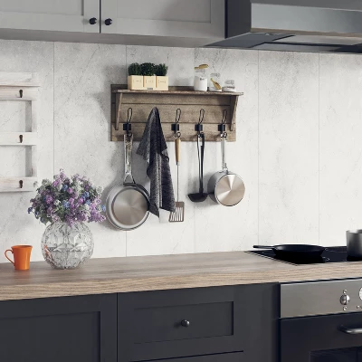 When space is at a premium vertical storage is essential to keep things neat and tidy as well as adding great style to your entryway, bedroom, or bathroom. This wall mounted storage shelf, featuring 5 rustic double hooks capable of holding up to 10 pounds allows you to hang your keys, umbrellas, or bags on the lower part and coats, scarves, or hand towels on the upper section. This mounted shelf is comprised of solid pine wood and boasts sturdy, inlayed hanging hardware and included screws and wall anchors allow you to have your new wall decor up and ready to go in 30 minutes or less.
