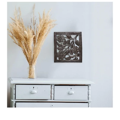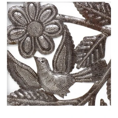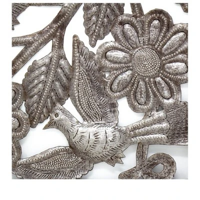 Crafted from recycled 55-gallon steel drums by village artisans in Haiti, these stunning pieces of art are truly one-of-a-kind! The process of turning sheets of metal into beautiful art is all done by hand. Steel drums used to transport oil into the capital of Haiti are cut, the oil is burned off to clean the metal, and then flattened in order to create stunning, upcycled art. Suitable for Indoor or Outdoor Use. Type: Metal Wall Art Colors: Metallic Materials: Upcycled Steel Metal Finish: Painted Dimensions: Approx. 111′ x 12.25 Care: If displaying outdoors it is recommended to spray with a clear lacquer once or twice a year, as prolonged exposure to the elements will cause rust. Hanging Instructions: To hang metal art simply use pin head nails in the many nooks and spaces available in the design. If nails are shiny, you may want to darken heads with a black marker to help nails visually disappear. Given the handmade nature of this product please allow for minor variations. As the metal is recovered from recycled oil drums and colored through a burning process it will vary slightly in coloration. Typically the piece has a darkened steel patina. If handpainted, exact colors may vary, which speaks to the one-of-a-kind nature of each piece. Each piece of metal art whether painted or natural is coated with a layer of clear lacquer to help protect the metal.