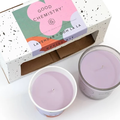 The Good Chemistry Lavender and Ooh La La Refillable Glass Candle and Biodegradable Candle Refill are a soothing vibe of serenity in a rolling field of florals. With notes of lavender, vanilla, violet, and sandalwood, the Plant-Based Lavender and Ooh La La Scented Candle Kit is designed to refill our glass candles again and again for a consistent and delightful home fragrance.