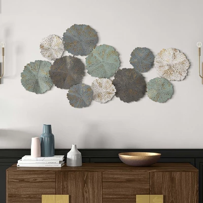 Dress up your wall with this stunning, handcrafted, floral-inspired wall sculpture. Eleven round flowers are connected and overlap making this is a beautiful handcrafted metal wall flowers in lovely soothing tones of gray, blue, green, and white. Each flower is purposefully distressed with gold accents that give the art piece depth and texture. At 48.4″x23.6″ in size, this wall decor arrives ready to mount to your bedroom, dining room, entryway, or office wall, and makes an impressive statement that is visually appealing and is substantial to use as a focal point of your wall, or as an accept piece in your room.