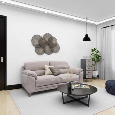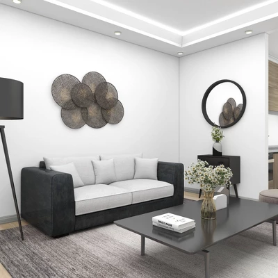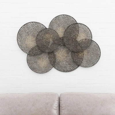 A black metal wall decor highlighting overlapping circles that will make a statement in any entryway, living room, bedroom, or dining area. This item ships in 1 carton. Can be hung horizontally using the metal rings on the back; nails and screws not included. Suitable for indoor use only. This item ships fully assembled in one piece. This is a single black colored wall sculptures. Industrial style.