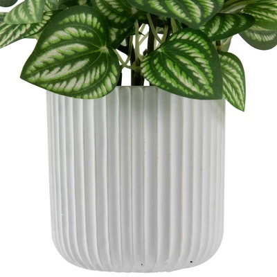This realistic Peperomia succulent features delicate spring leaves in a vibrant green hue, set in a white, textured line pot, can be displayed anywhere. With no watering or sunlight required, this plant is the perfect way to bring a touch of the tropical outdoors into any room without the hassle of caring for live plants. Whether you’re looking to liven up your living room, add some greenery to your office, or brighten up your bedroom, this Peperomia Watermelon leaf plant is sure to bring the freshness of spring to your home.Features:Artificial potted Peperomia plantGreen foliage is attached to an artificial moss baseNestled inside of a mini white fiberstone pot with a textured line designFor indoor use only Dimensions: 6.5″ high x 6.5″ diameter (approximately)Pot dimension: 3″ high x 3.25″ diameterMaterial(s): plastic/fiberstone