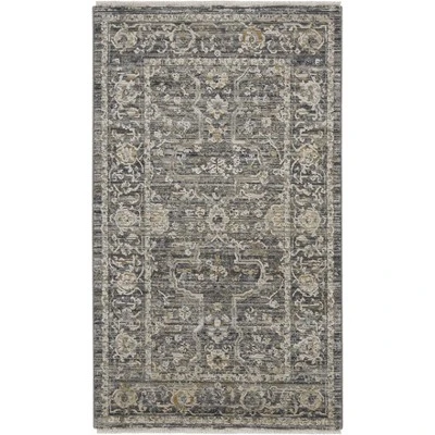 Elevate your décor with the vintage charm of this Persian floral rug from the Nyle Collection. Showcasing an elaborate pattern in slate grey and ivory multicolor, the design is finished with an abrash effect that mimics an antique look. Machine-made from softly textured, easy-clean fibers with metallic serged edges, fringe at both ends, and subtle high-low accents. Runners do not include the fringe.