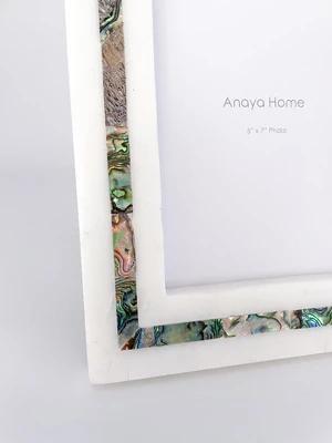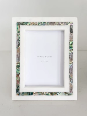 The Rainbow Mother of Pearl White Marble Picture Frame features the Genuine Mother of Pearl stripe accent with a natural iridescent White and Golden color tone. When light hits each piece, the iridescent colors shine bright against the White Marble background creating a luxurious, natural experience. Each piece is hand made; white gift box included.