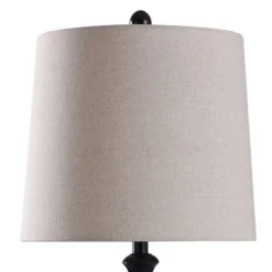 - The body of the lamp is brushed in bronze and has a teardrop shape. The lamp shade is a light beige color.