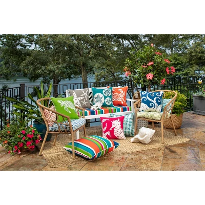 Look at what washed up your way. The Sassy Sand Dollars throw pillow with high styled oceanic beauty. It makes a perfect addition for any indoor or outdoor setting. On the pillow’s front, each of the three off-white sand dollars is decorated with a unique teal embroidery design. They’re off centered and set against a contrasting teal ground. The coordinating pillow back is an ottoman weave with a pronounced ribbed texture. UV protected, made of 100% durable polyester. Additional features of this outdoor throw pillow include a coordinating off-white welt cord for a beautiful finish and recycled polyester fiber fill with a sewn seam closure. Also suitable for indoor use.