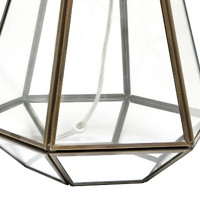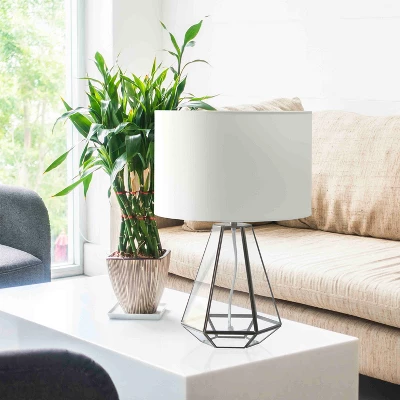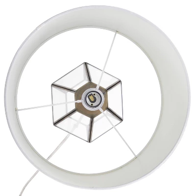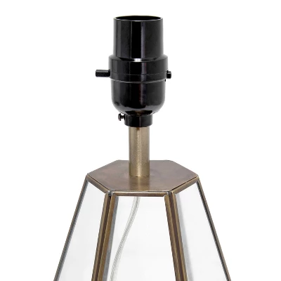 A stunning piece of décor suited to properly light your space is the key to designing this gorgeous triangular shaped table lamp. A transparent glass base with brass metal accents is paired with a white drum shade to inspire a vintage feel with modern class. The glamour and elegant style of this lamp powers on with a push pin on/off switch making it convenient to place bedside, atop your living room accent table, your foyer entrance, or office space!